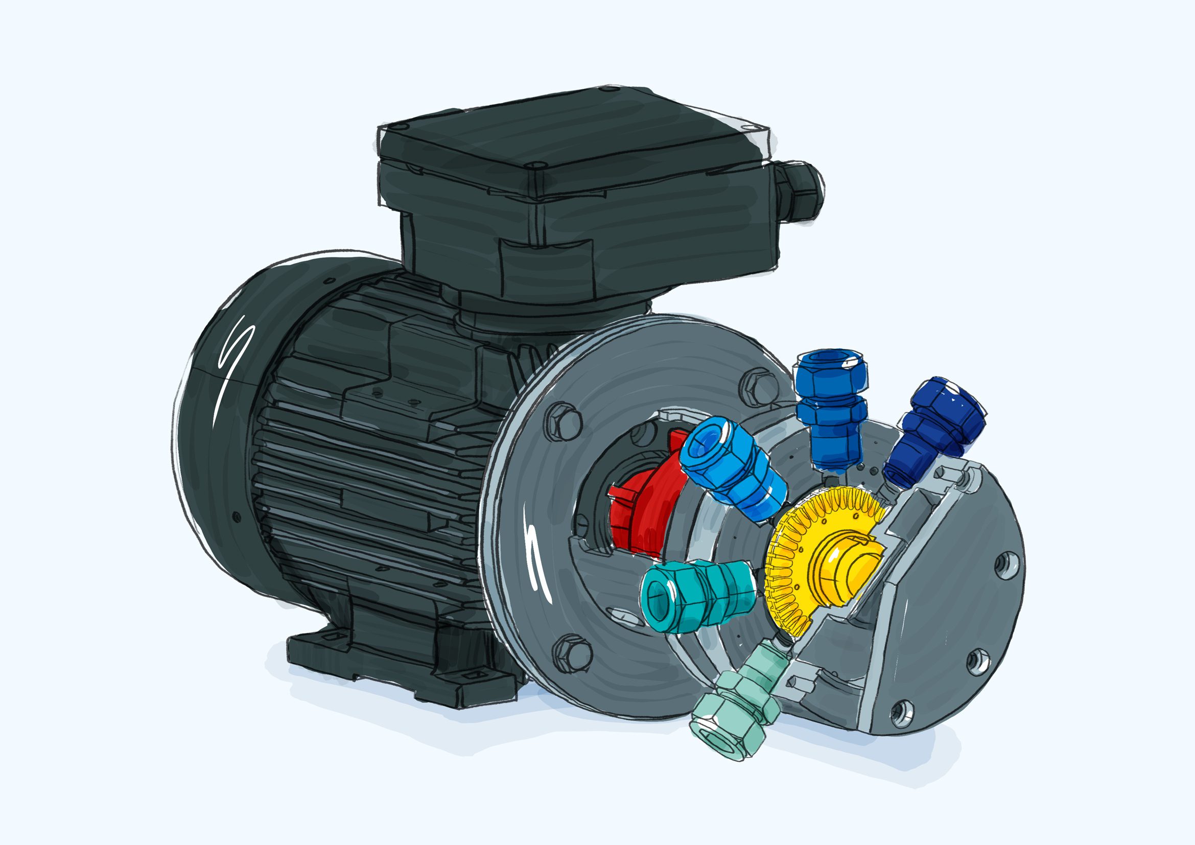 The pumps of series Espira E02 are a magnetically coupled special form of the peripheral impeller pumps . These pumps, which we developed in cooperation with BASF, take advantage of the characteristic properties of the peripheral impeller pump: The rotation of the impeller causes the pressure in the peripheral delivery cells to rise rapidly. The exchange of momentum between the impeller and the delivery channel, as well as reverse flows due to a pressure equalization within the pump head, cause intensive turbulence of the pumped medium. This enables intensive mixing and homogenization processes within the pump head during the conveying process.